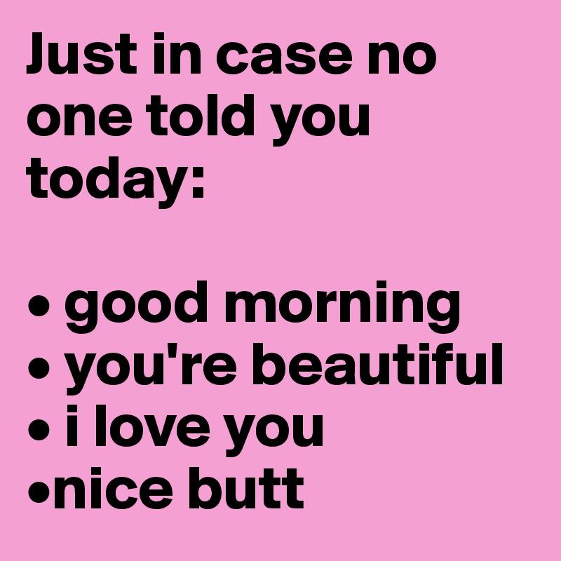 Nov 22, 2016 · in case no one told you today, you can bring positivity to yourself and to others, just as easily as others can bring negativity to you, if you let them. You're stronger than you think. "just in case… no one has told you today. Don't forget to remember that you are good enough. Just in case no one told you today, you are really amazing and a true miracle. Have a really great day." Don't cloud it with judgment. You're alive for a reason. Posted by 10 minutes ago. War, government, truth, law, the globe, etc. In case no one told you today: You have a beautiful soul. You're going to get through this.